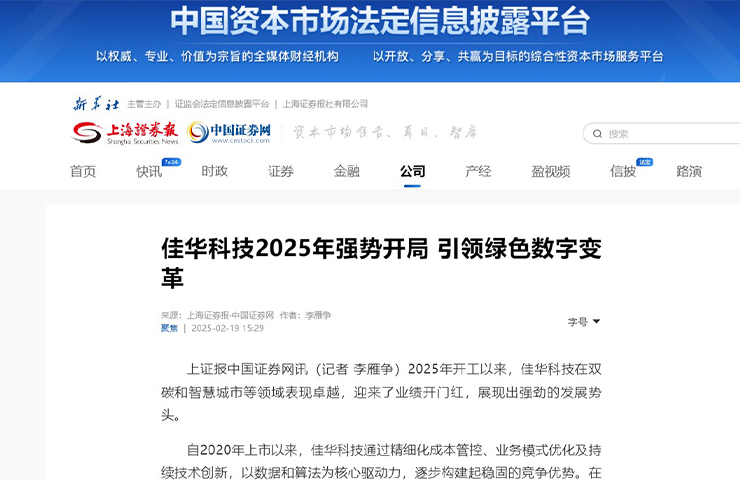 上海證券報 | 佳華科技2025年強勢開局 引領綠色數字變革 2025年開工以來,佳華科技在雙碳和智慧城市等領域表現卓越,迎來了業績開門紅,展現出強勁的發展勢頭。 了解更多